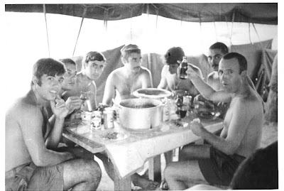 Foto 1: O Capitão Miliciano Hélio Augusto Moreira (em primeiro plano com uma garrafa de cerveja na mão) na companhia de: (da esquerda para a direita) Saavedra (Soldado Condutor), Pepino (Soldado Corneteiro), Costa (Furriel Vague Mestre), Leite (Soldado Condutor), "Françês" (Soldado Cozinheiro) e do Cardoso (1º Cabo Auxiliar de Enfermagem), num petisco onde se comemorava o 1º aniversário da C.CAÇ. 3309. 24 de Janeiro de 1972.